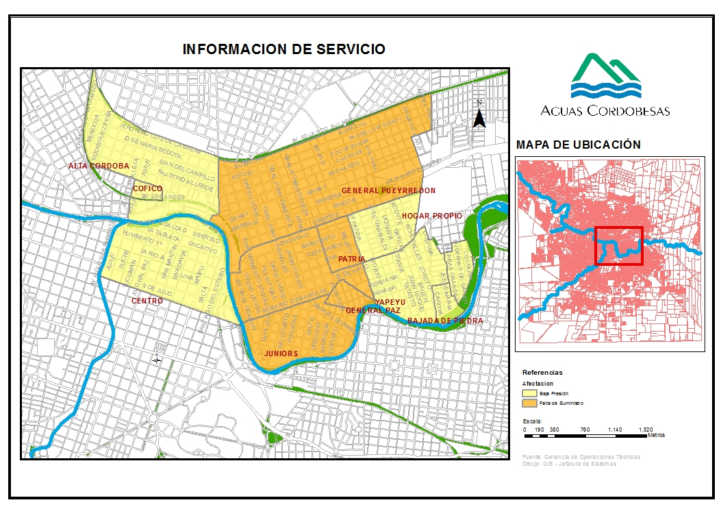 En tanto que podrán percibir baja presión: Hogar Propio, Yapeyú, Ampliación Yapeyú, Bajada de Piedra, Cofico, zona sur de Alta Córdoba y Centro Norte (Av Olmos, Costanera y Avenida Figueroa Alcorta).