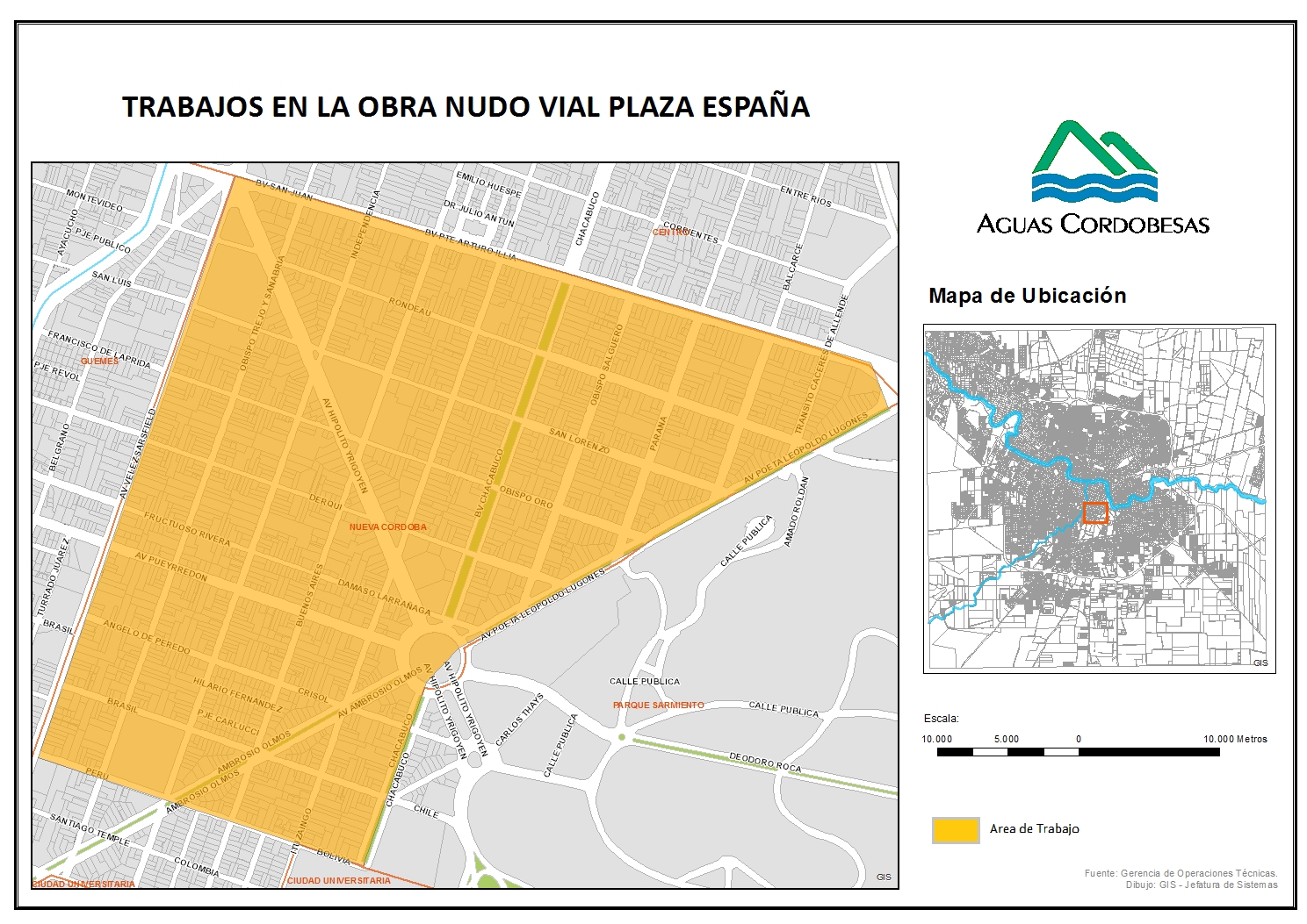 La empresa Aguas Cordobesas informó que el domingo 24 de marzo, se continuarán realizando tareas complementarias a la obra del Nuevo Nudo Vial Plaza España.